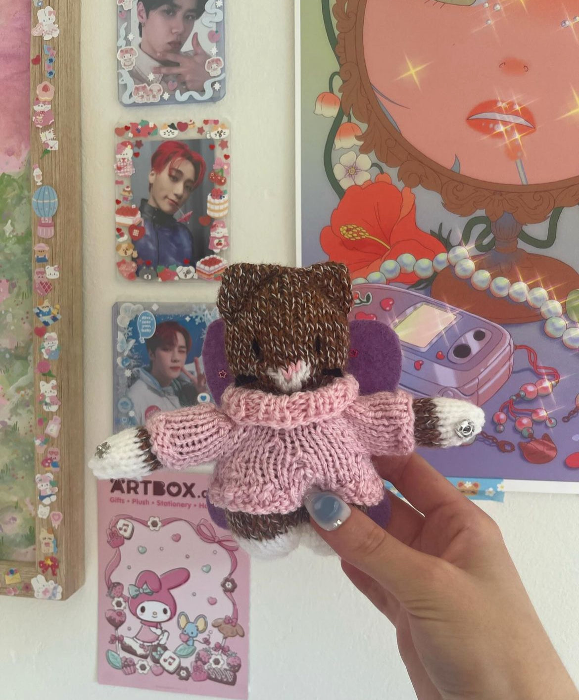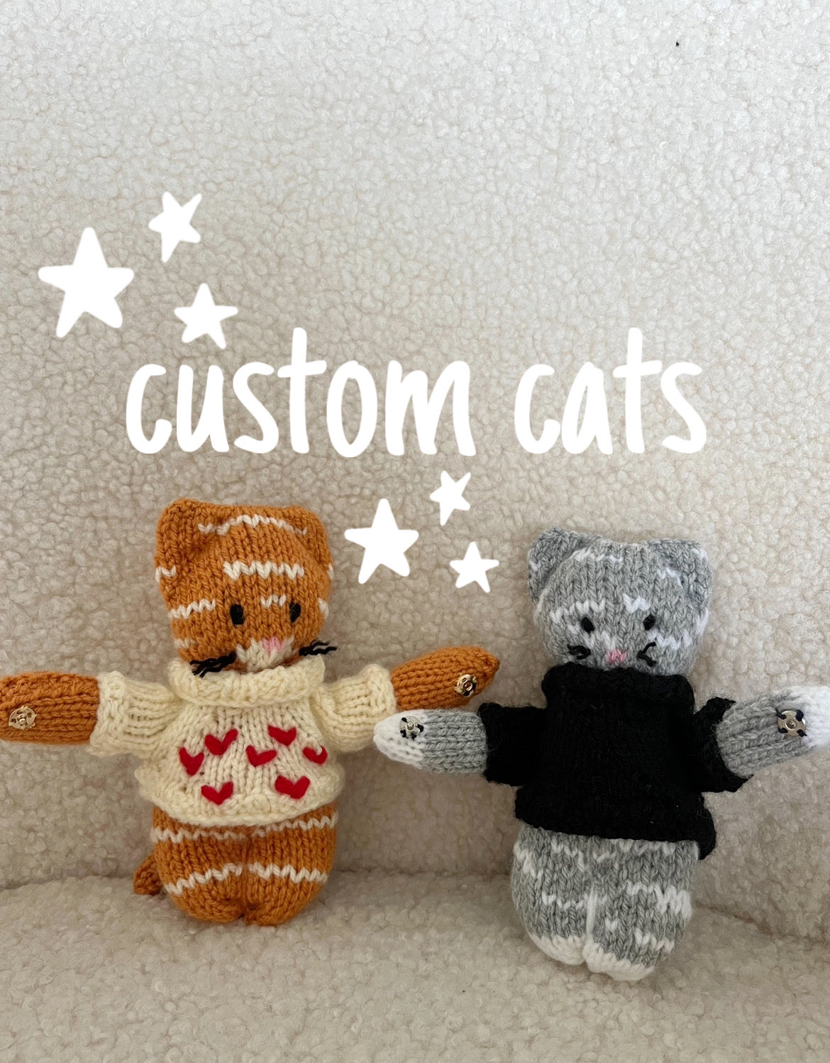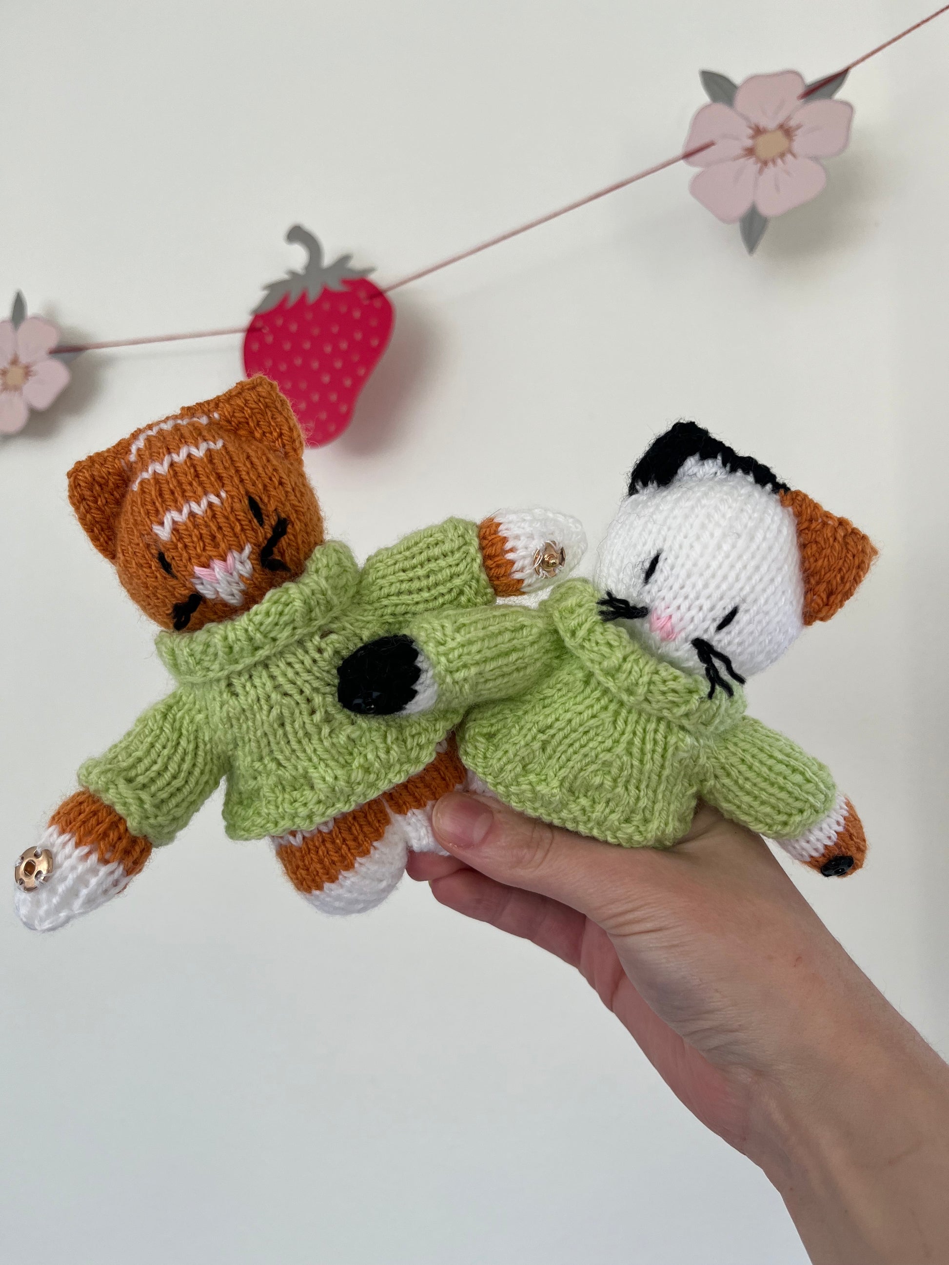 Handmade knitted cat companions! Every cat comes with it's own custom jumper to keep it warm and stylish and poppers on their paws so they can hold onto your bag straps.